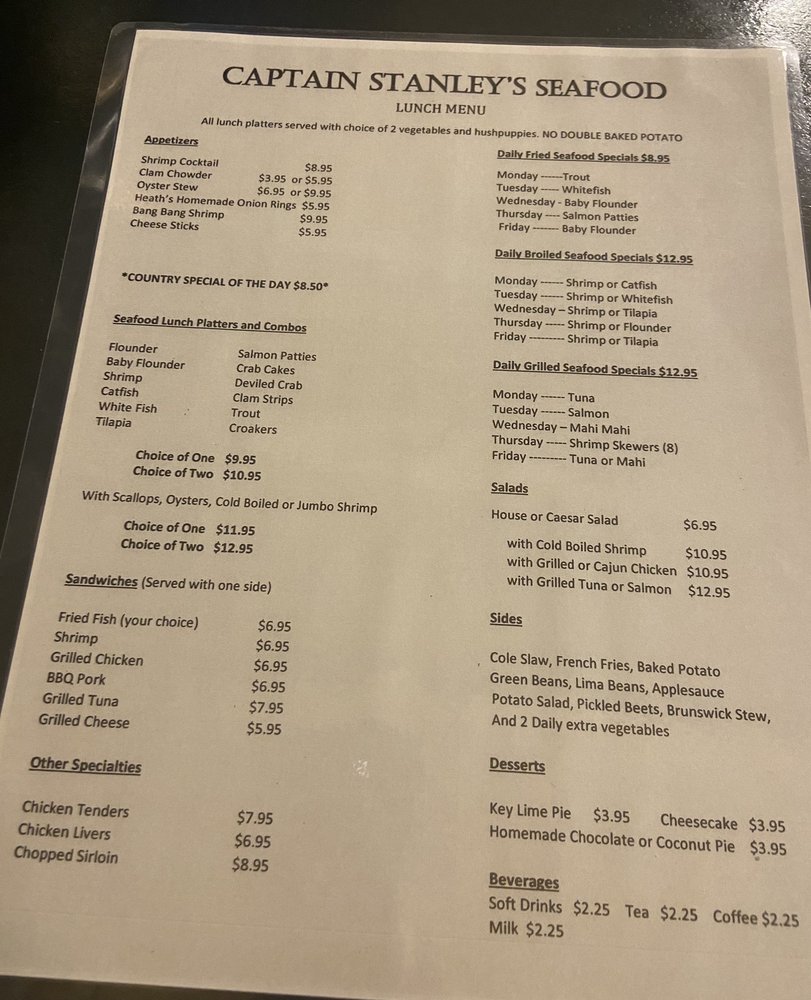 Captain Stanley's Calabash Seafood is a seafood destination located in Raleigh, NC, offering a variety of seafood dishes with options for vegetarians. The menu includes classics like fried scallops, shrimp, crab cakes, clam strips, and Alaskan Whiting. Customers have praised the portion sizes, reasonable prices, and quick service. While some dishes like the shrimp may have been lacking in seasoning, the crab cakes and clam strips have received high marks for their flavor and quality. The atmosphere is described as reminiscent of a small beach town, adding to the overall dining experience. With options for takeout, delivery, and catering, Captain Stanley's is a convenient choice for seafood lovers looking for a casual dining experience.